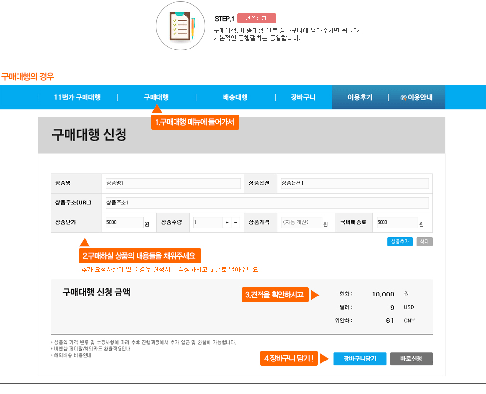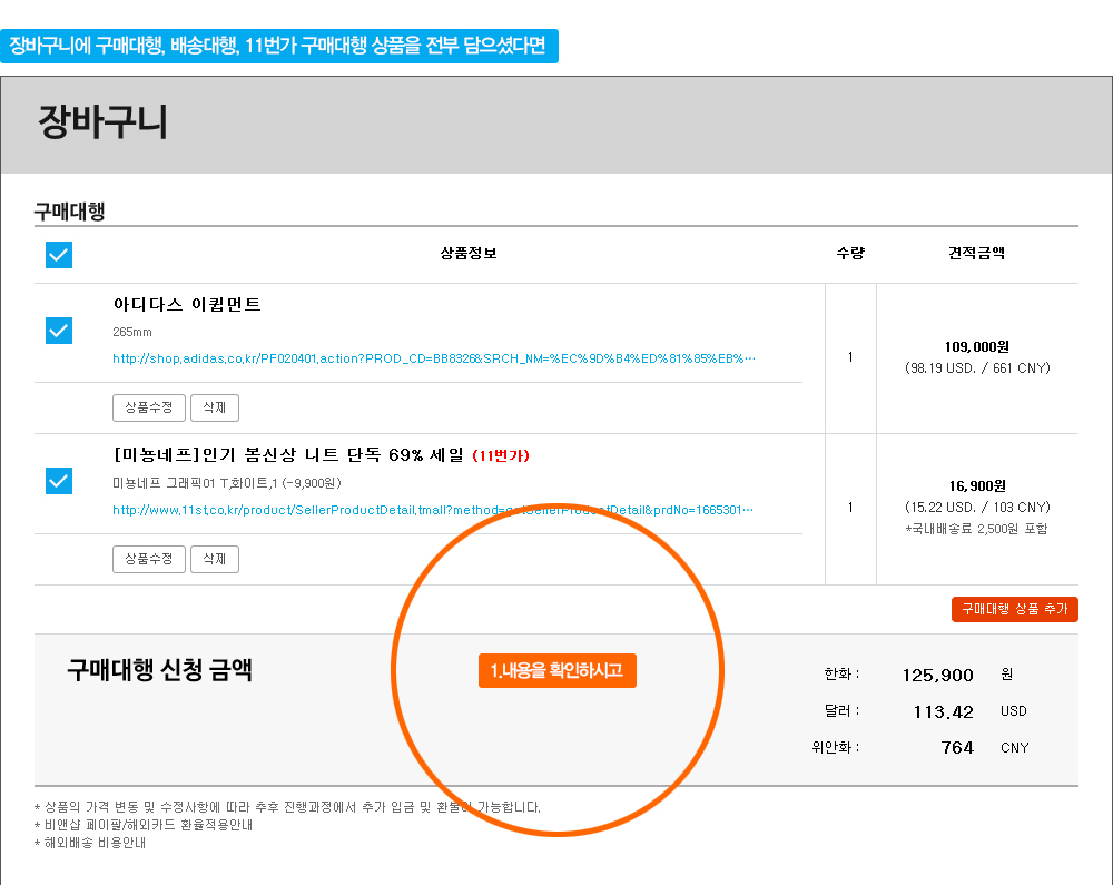 장바구니에 구매대행, 배송대행을